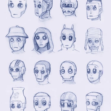 Their face is painted with cosmetic identifiers, expressions of individuality unique to each robot. Their eye lights indicate an emotion state. In this case, blue is sadness. This robot is depressed.